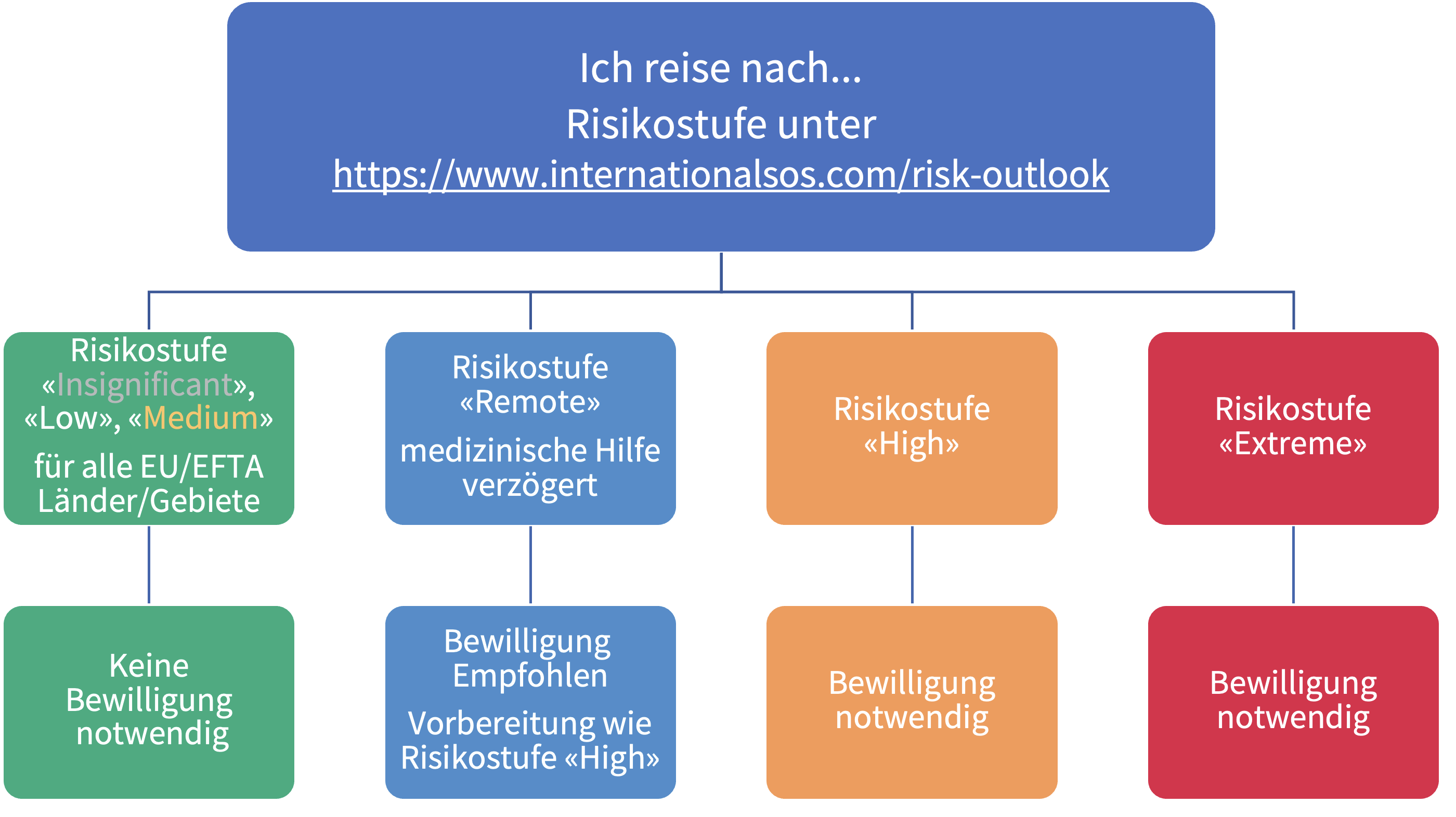 Prüfen Sie mit Hilfe der folgenden Dokumente die Risikoeinstufung Ihres Reiselandes bezüglich des «Security-Risk», publiziert auf der Travel-Risk-Map von «International SOS». Keine Bewilligung benötigen sämtliche Reisen und Auslandaufenthalte in EU/EFTA-Staaten und in Länder und Gebiete der Risikostufe «Insignificant», «Low» und «Medium».