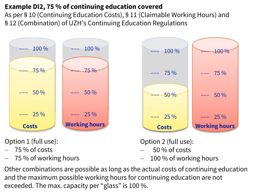 - This agreement states that UZH supports Christopher’s continuing education plans with a degree of interest of 2. According to § 9 para 2 CER, UZH will therefore cover up to 75% of the continuing education costs and up to 75% of the working hours needed for the program. However, in accordance with the “and/or” option provided for in § 12 CER, the share of claimable working hours may be reduced in favor of the share of training costs covered, and vice versa. The “two-glass model” (JPG, 90 KB) can be used as a calculation aid: as long as neither glass “overflows” (working hours: 19 course days or continuing education costs: CHF 8,900), the total 150% can be spread out as desired.
