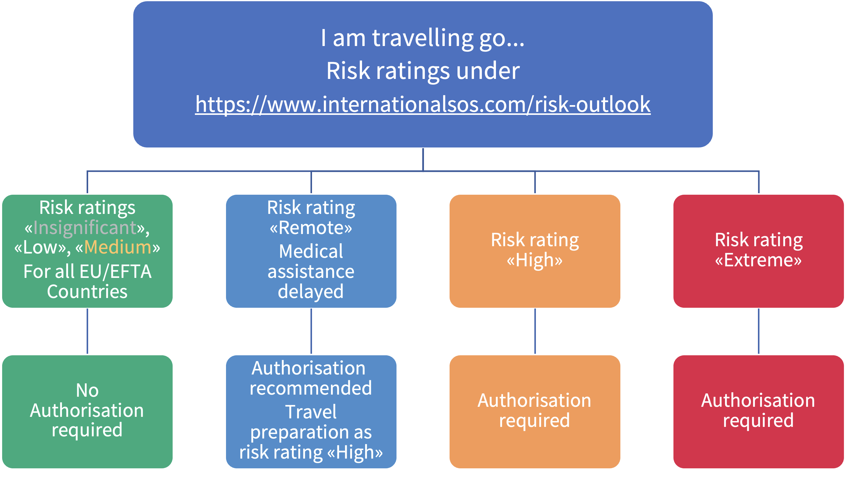 Please use the following documents to check the risk classification of your destination country with regard to security risk, as published on the Travel Risk Map by International SOS. No authorisation is required for all travel and stays abroad in EU/EFTA countries and in countries and areas with a risk level of ‘insignificant’, “low” or ‘medium’.